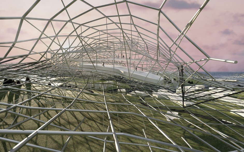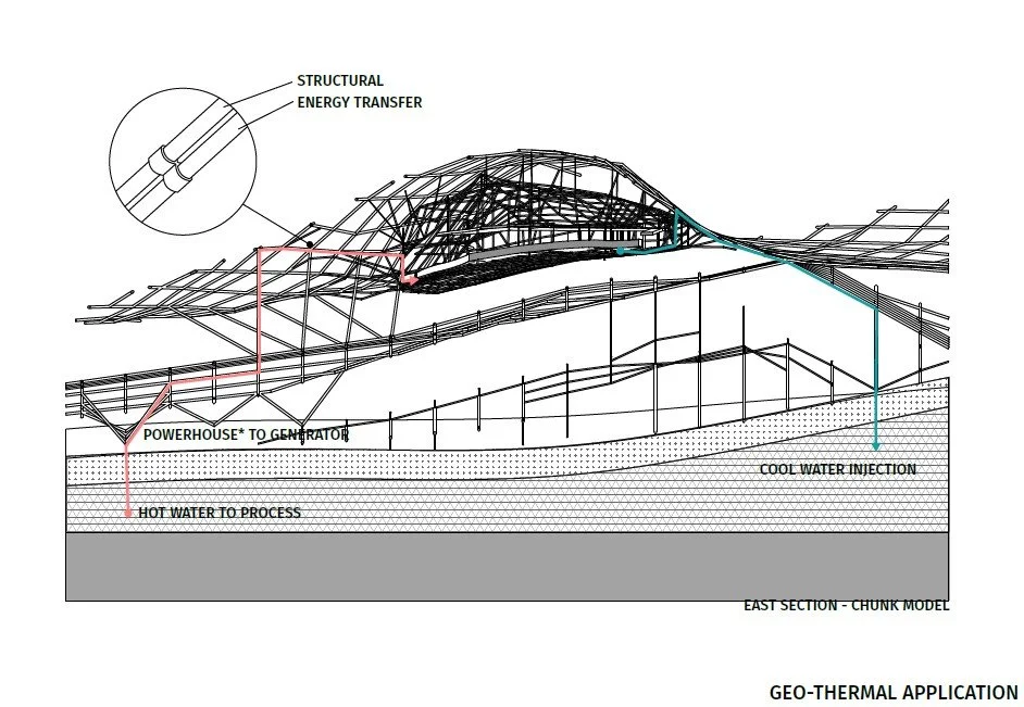 The pipes of the Structural element also serve as pipes that deliver the Geo-thermal Energy throughout the island.