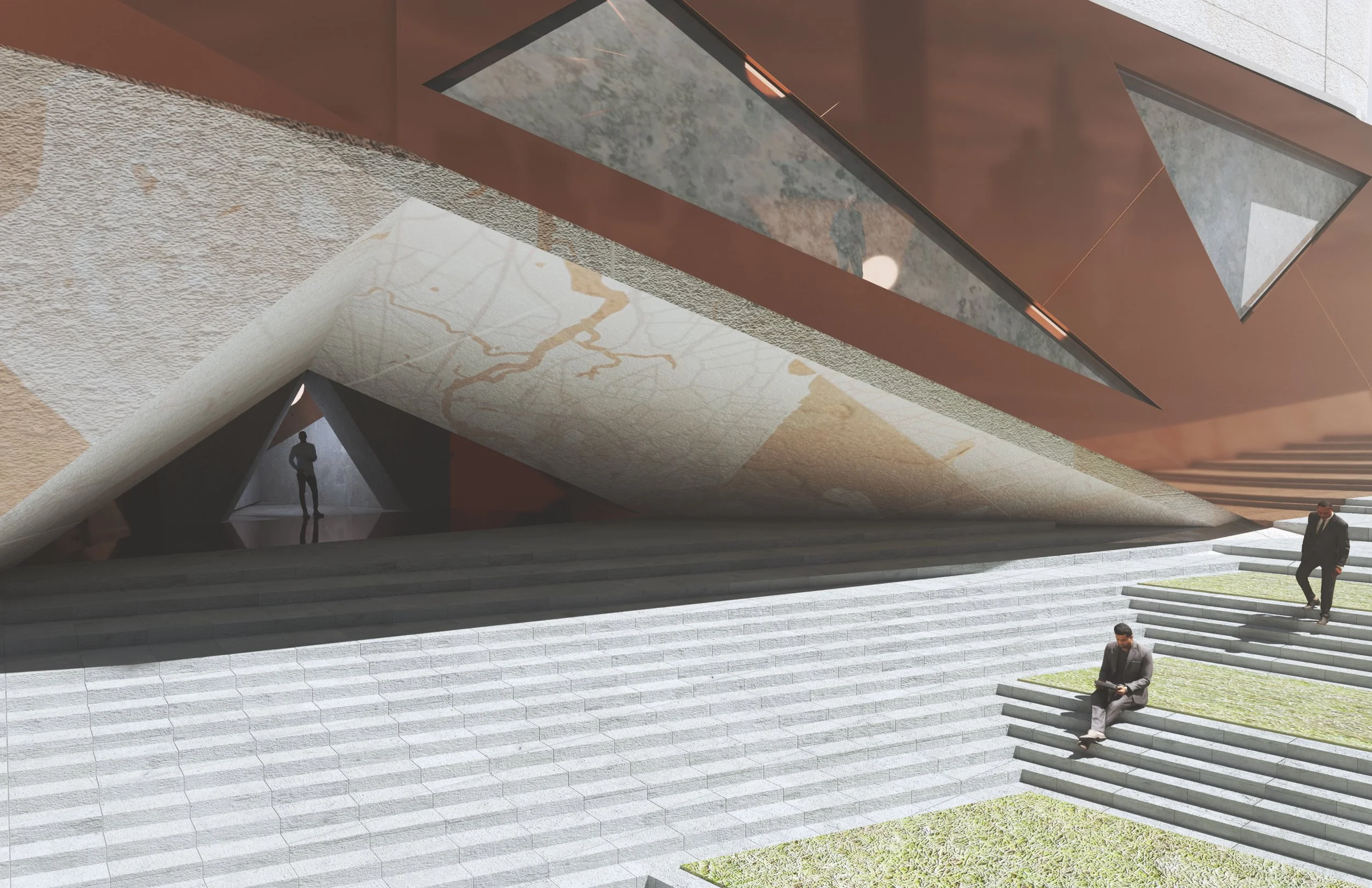The facade of the building shows two different materialities. One is the precast relief panel and the other is a metal circulation volume that cuts in and out of the skin.