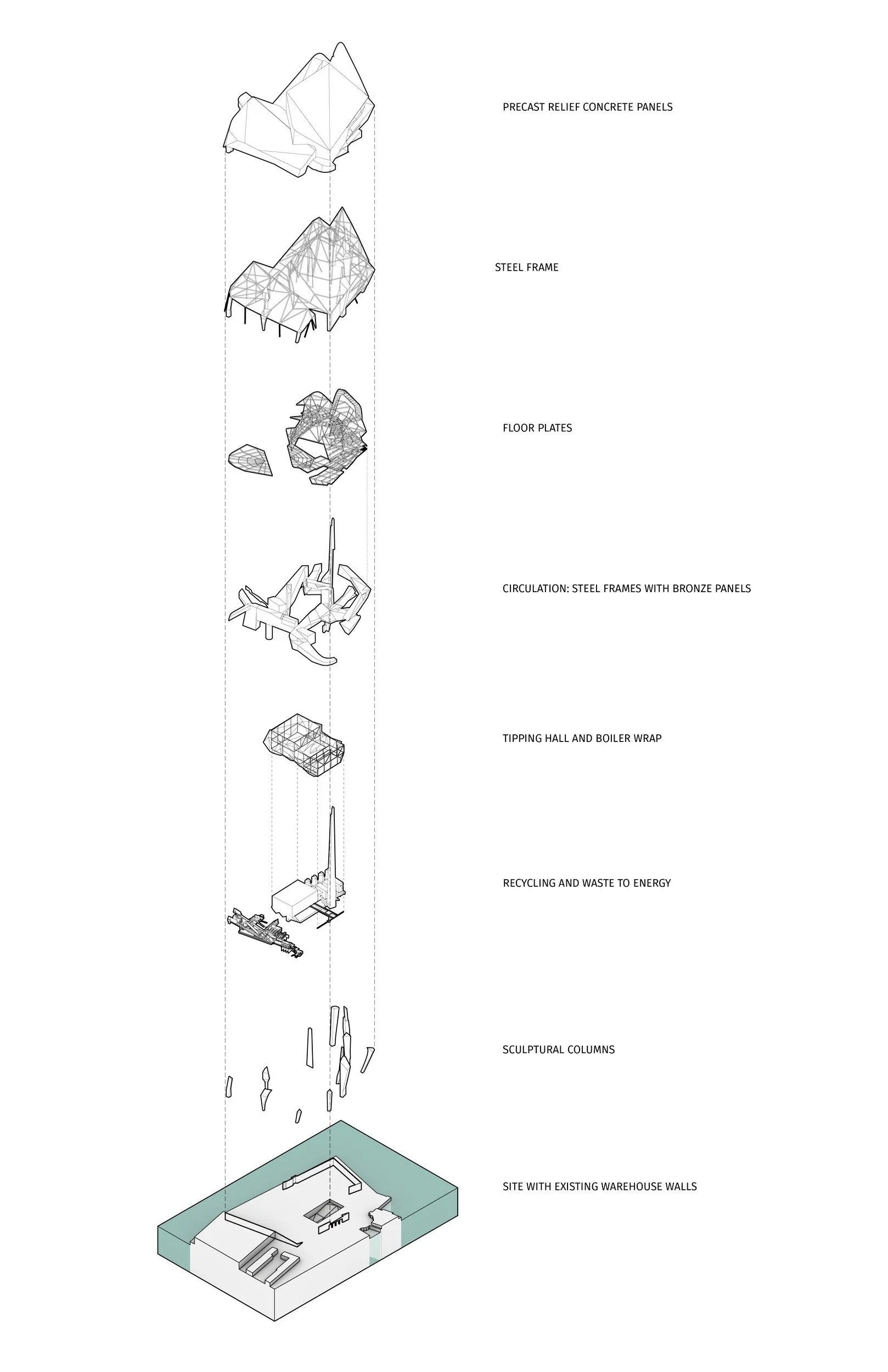 Structurally, the key elements include the existing warehouse, sculptural columns as main structure, wrapper for the machineries, circulation volume, floor plates, and the façade structure.