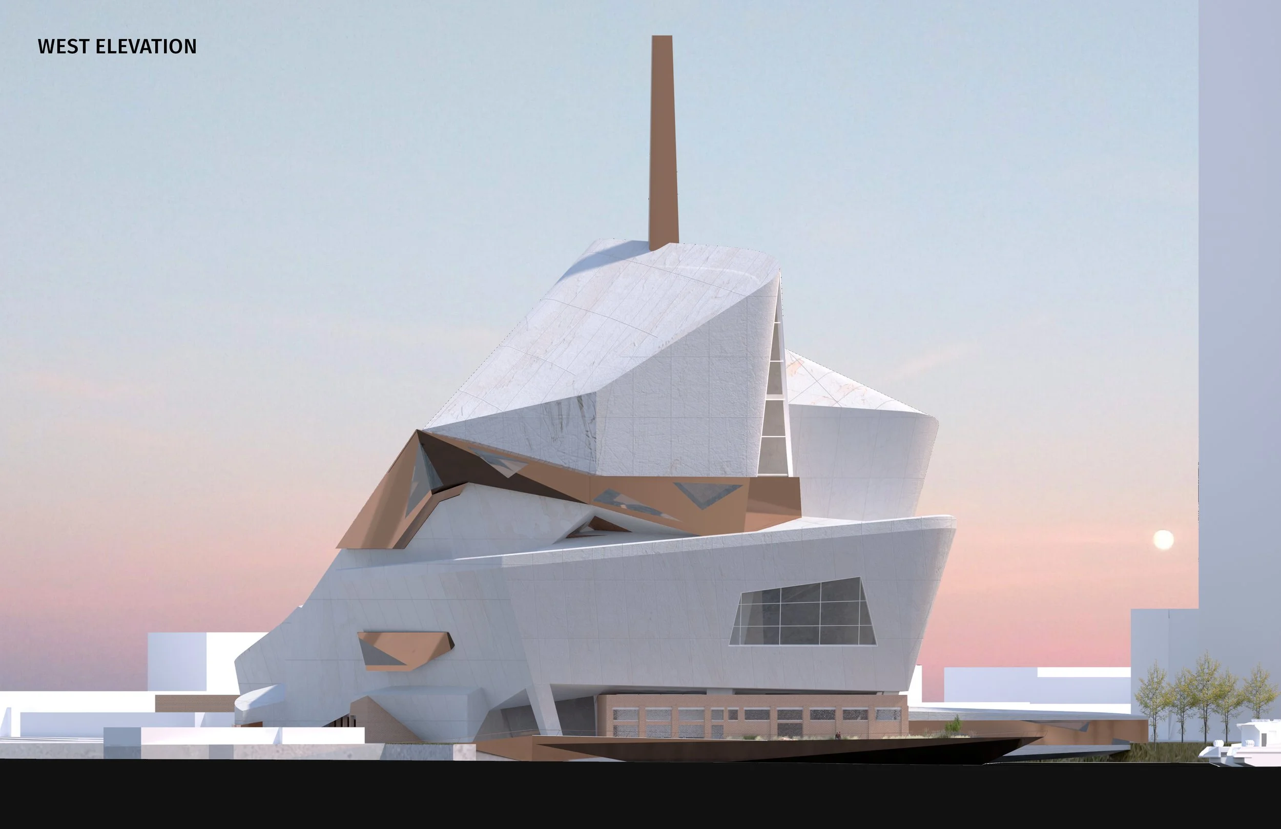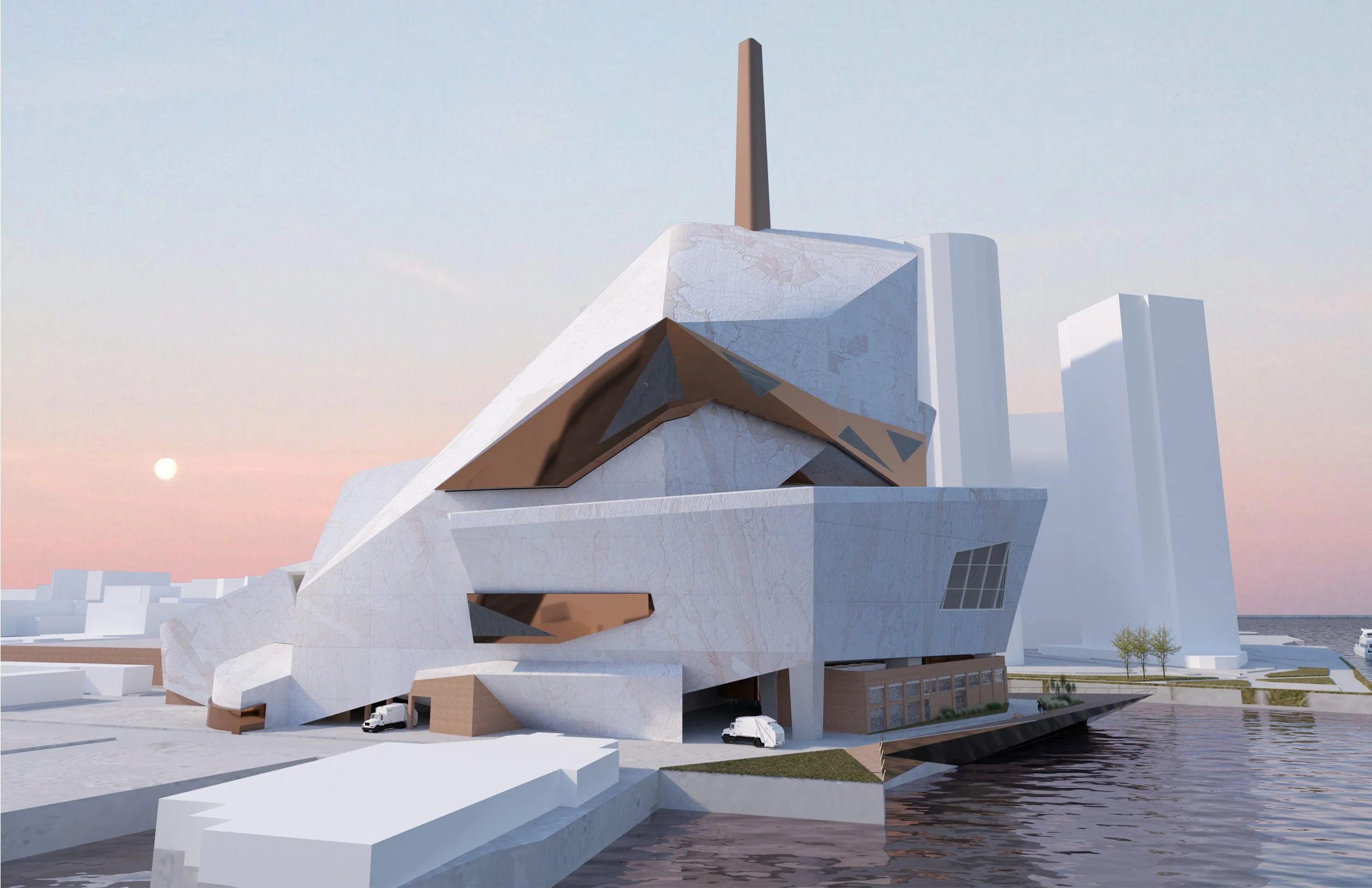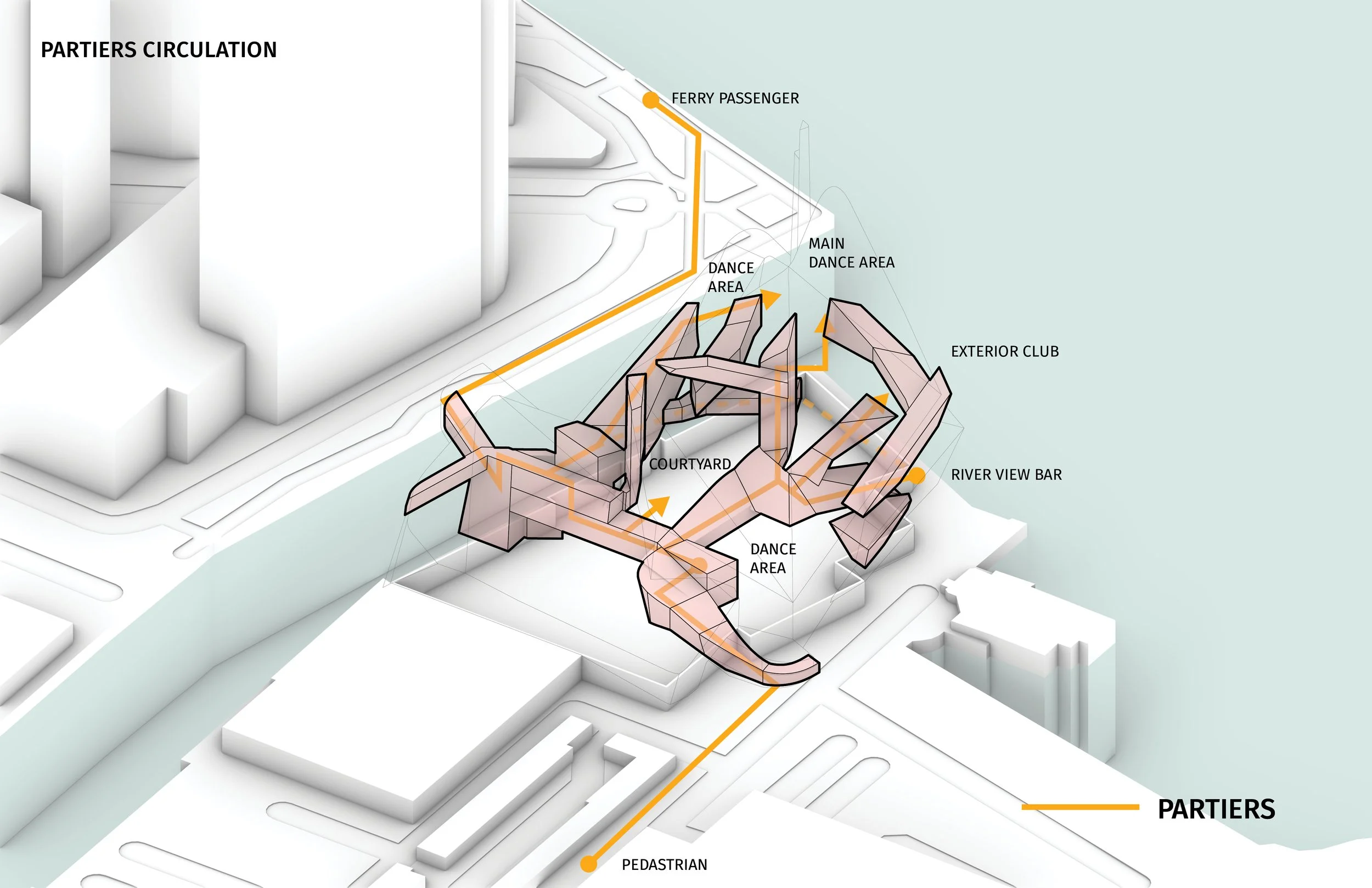 While connecting all directions of the neighborhood through land and water, “Re-” serves as a middle ground between the waste to energy and recycling machines and a nightclub of spiritual journey for individuals. The interior space and the exterior space of the building intersect each other to develop largely spaces for the static machines and dancers to populate while the circulation volume takes the party-goers on a journey throughout the steps of the machining process and accomplishing it by ending at the main dance hall on the top along with the exterior club facing the river. this journey interacts with the treatments of the wastes and finishes cohesively as the re-fresh of bodies and minds happens.