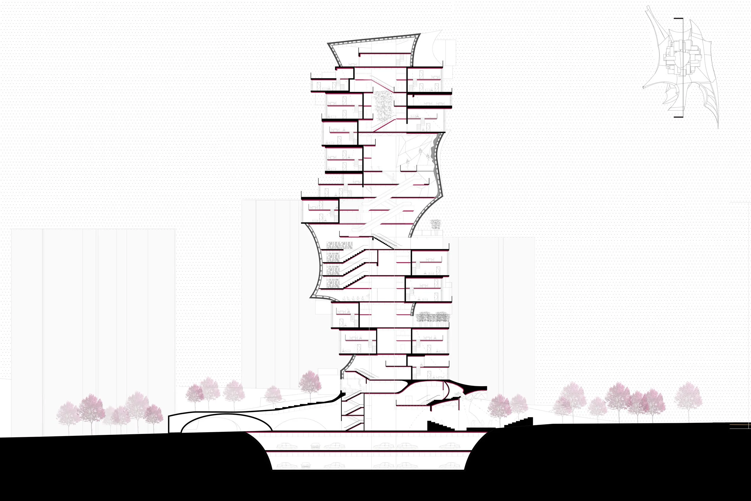 The tower is located at the top right corner -- our chosen site location. And the site structure is all over the site to create a whole new landscape, eventually connect to the tower.