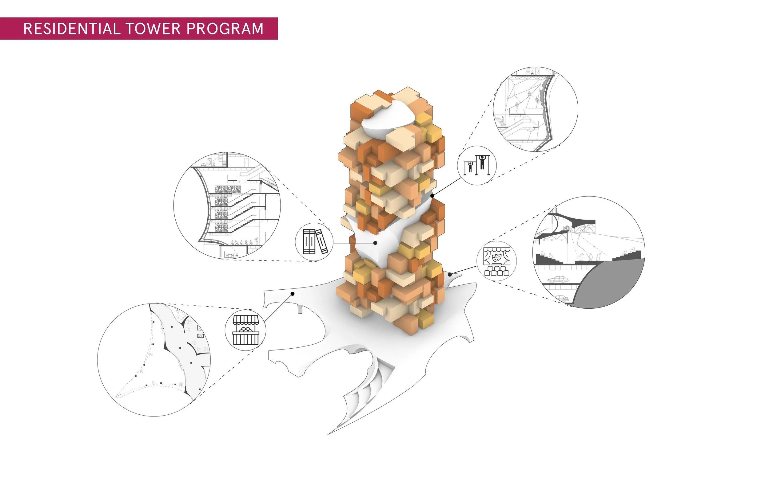 There are 4 different kinds of units aggregating into the combination of the building by populating themselves within the added programs(Such as Gym, Library, and Shopping Mall) throughout the building.
