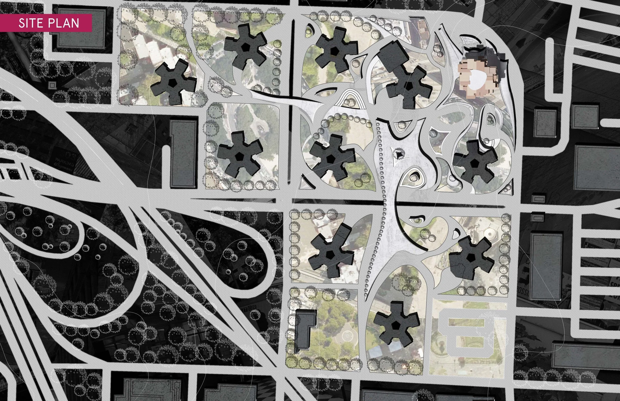 The design started with the collage. By mapping the surrounding areas onto the site in different scales and orientations to create a system that combines original site-building conditions as well as foreign elements from surroundings.