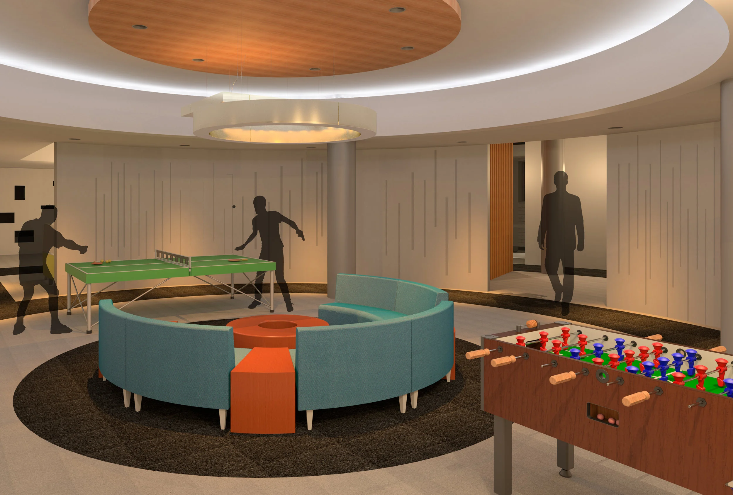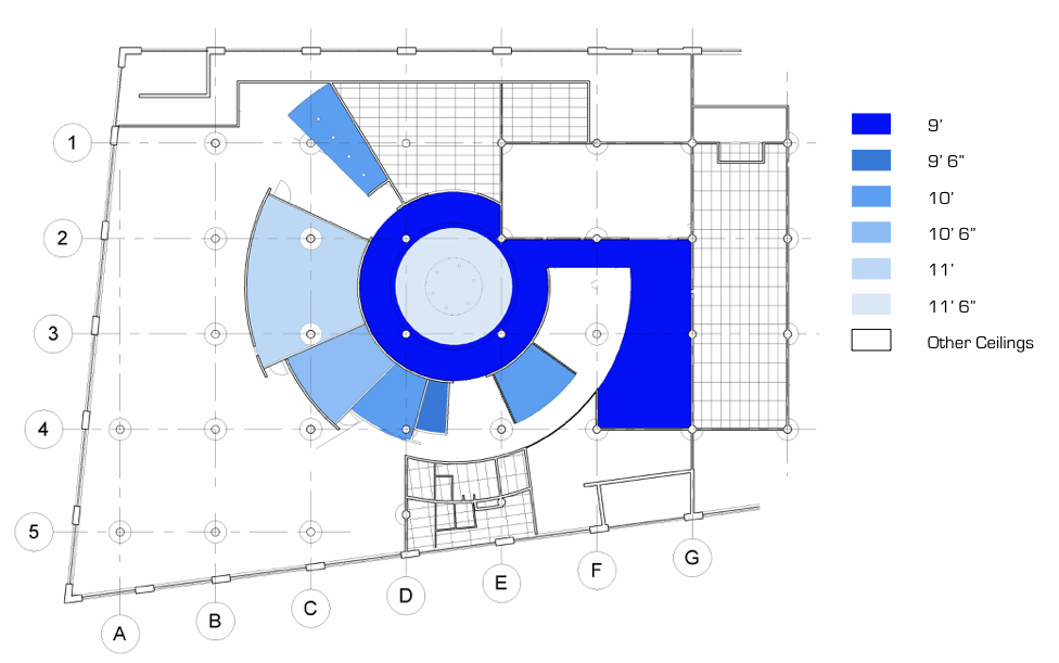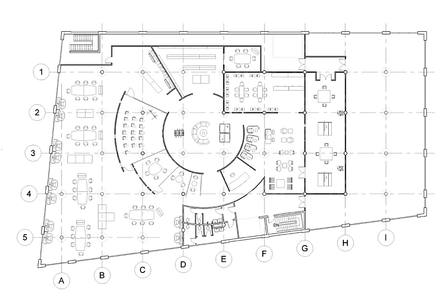 Through the intersections of the circular and diagonal shape, the letter "G" brought a lot of possibilities. The circular sections are used as conference rooms while the center circle becomes a group gathering area. Naturally, the space on the left becomes the "Group Working Area" as itself.